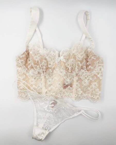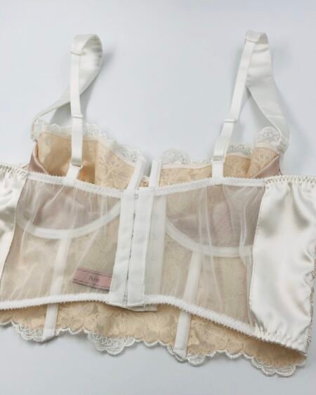 This white lace bra is realised in a corset longline bra shape from French Calais lace with a back made from stretch mesh to allow for maximum comfort and range of motion. It is fully lined with nude lining for discretion and comfort.