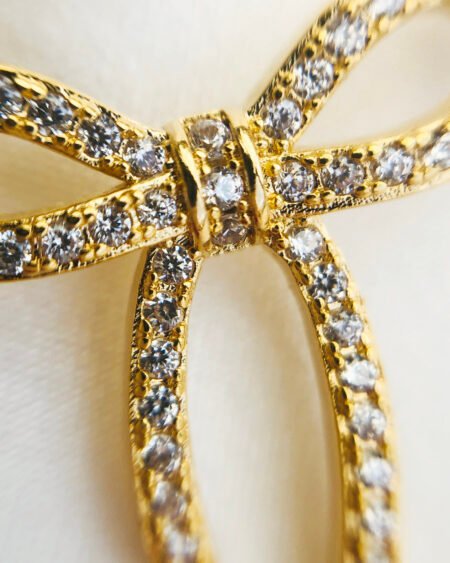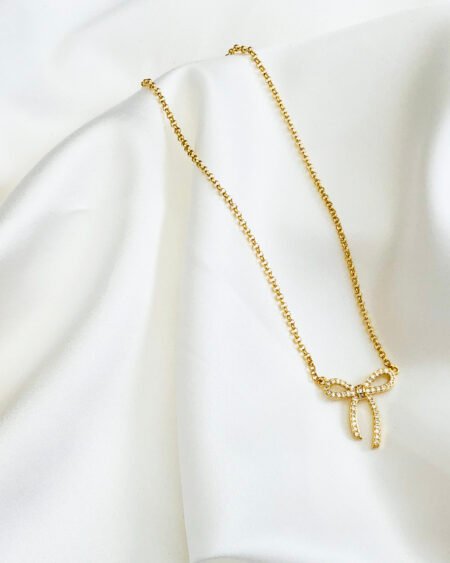 This necklace has been created from a chain plated in Gold and soldered to a pendant enhanced with crystal real Zirconium with the shape of a bow.