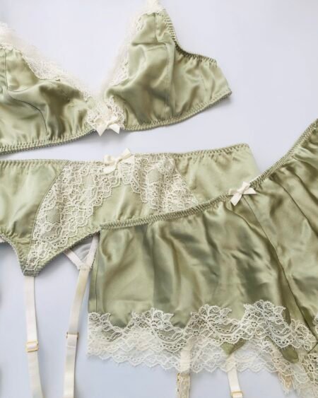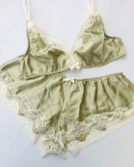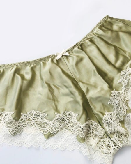 Those silk panties are realised in green spandex silk mixed with French leavers lace edging. Strong yet very elegant it makes beautiful soft knickers. The cut is a slightly low waist and is super comfortable. The shape is French cut panties on the back and boyshorts for the front.