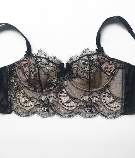 I’ve realised this longline bra in a soft black french Chantilly match with a black satin stretch silk. The stretch silk panel on the side is giving the confort. The straps are realised in satin silk. They are very comfortable and adjustable in the back. The shape of the cups are balconette.